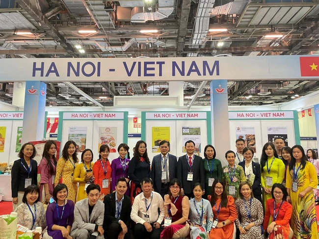 Phó Giám đốc Sở Công Thương Hà Nội Nguyễn Kiều Oanh (thứ bảy bên trái) cùng đoàn doanh nghiệp Hà Nội tại Hội chợ triển lãm FLAsia 2023