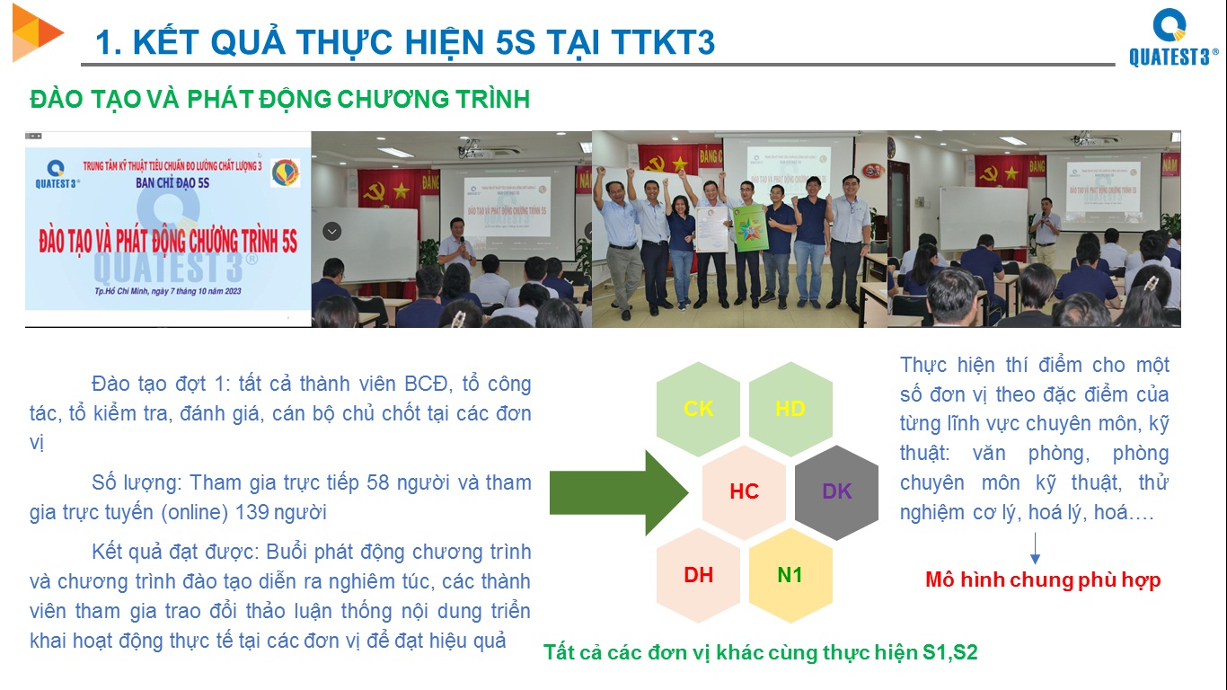 Còn theo báo cáo của Trung tâm Kỹ thuật Tiêu chuẩn Đo lường Chất lượng 3 (Quatest 3) tại TP Hồ Chí Minh, 5S đã được triển khai và điều chỉnh phù hợp với điều kiện thực tế của Trung tâm. Kết quả triển khai bước đầu đã cải thiện hình ảnh, tạo thói quen, sự tự giác, thúc đẩy văn hóa cải tiến. 5S cũng đã từng bước tạo văn hoá và kết nối các thành viên của Quatest 3. Tạo nên những thay đổi tích cực về cảnh quan môi trường, tạo môi trường làm việc thân thiện, thuận tiện trong công việc, nâng cao hiệu quả làm việc.