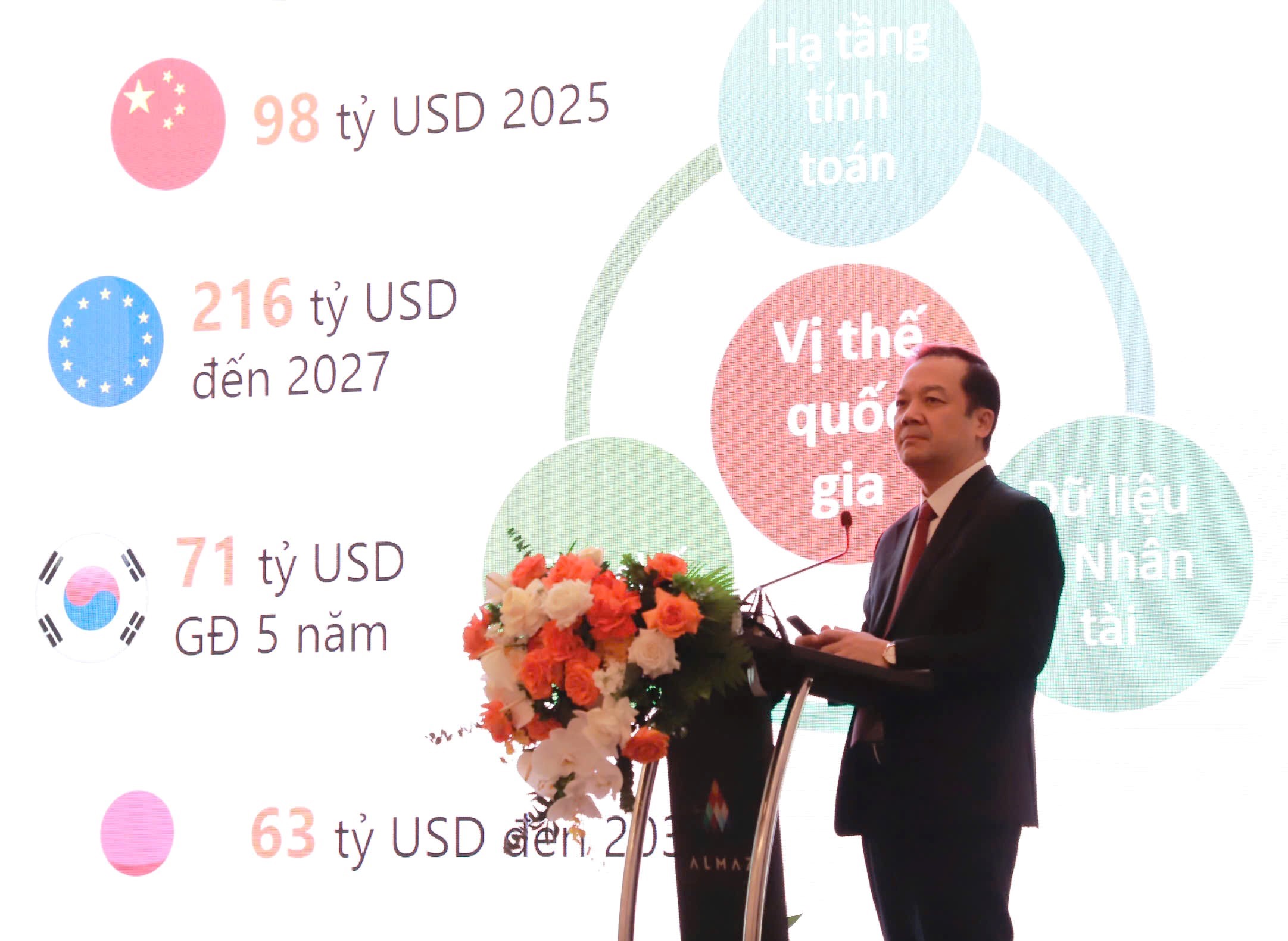 Theo Thứ trưởng, AI đang trở thành tâm điểm chiến lược của các quốc gia bởi nó có thể làm thay đổi vị thế một đất nước nếu làm chủ và dẫn dắt được công nghệ này. Vì là tâm điểm, AI tạo ra ba cuộc đua lớn: hạ tầng tính toán, thể chế và dữ liệu.