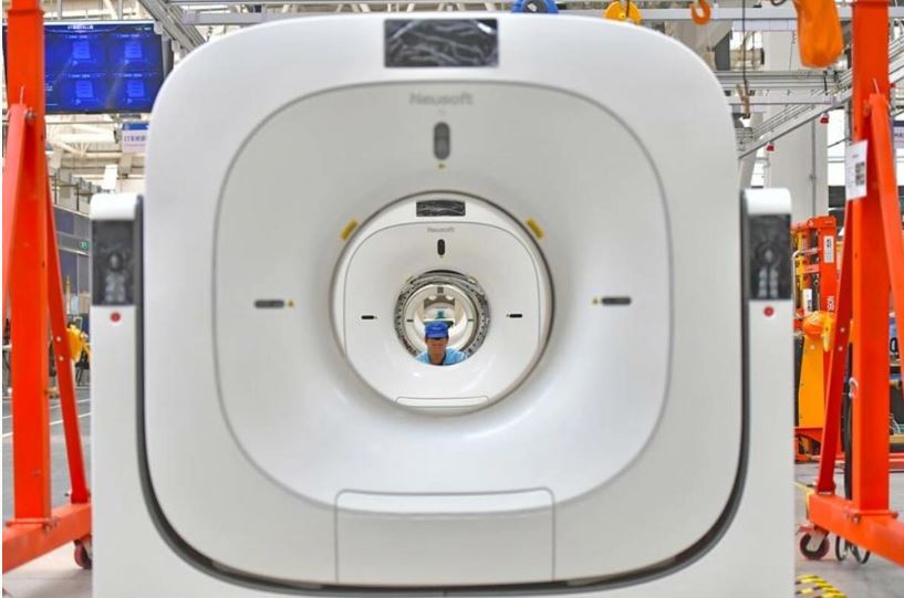 Một người đàn ông làm việc tại xưởng máy CT tại Neusoft Medical ở Thẩm Dương, Trung Quốc, tháng 5/2024. (Ảnh: Xinhua)