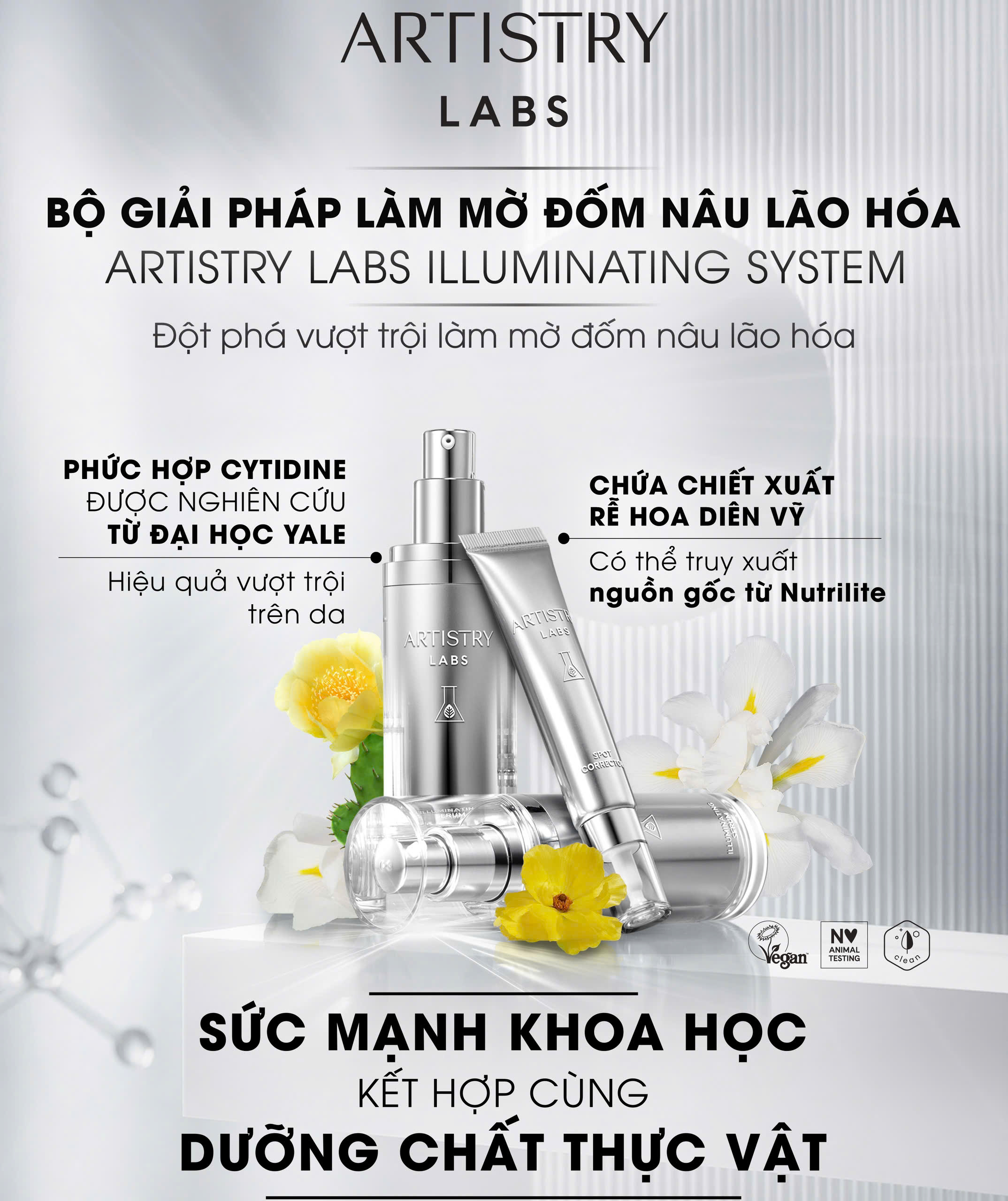 Artistry Labs Illuminating System ghi dấu ấn với các hoạt chất tiên tiến, có hiệu quả cao, được nghiên cứu và phát triển thông qua sự hợp tác chặt chẽ với các viện nghiên cứu và trường đại học danh tiếng toàn cầu có thể kể đến là Đại Học Yale tại Mỹ. Sản phẩm là sự kết hợp hài hòa giữa khoa học hiện đại và dưỡng chất thực vật tinh túy, hoàn toàn thuần chay, mang đến giải pháp chăm sóc da vừa hiệu quả vừa dịu nhẹ. Bộ sản phẩm đạt chuẩn mỹ phẩm sạch Artistry Clean và được Hiệp hội Vegan Society chứng nhận, cam kết không chứa thành phần có nguồn gốc động vật, không thử nghiệm trên động vật, đồng thời an toàn cho cả làn da nhạy cảm.