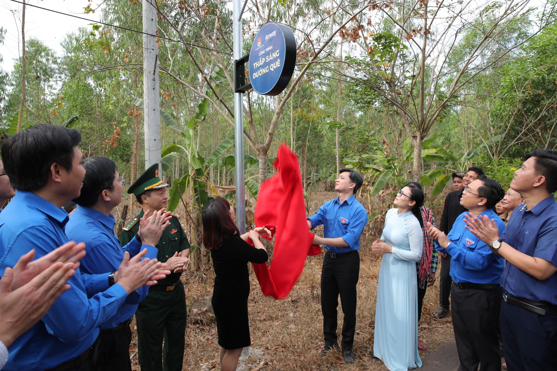 Amway Việt Nam trao tặng trụ và hệ thống đèn năng lượng mặt trời trên tuyến đường gần 2.000m. Ảnh: Trương Hiện