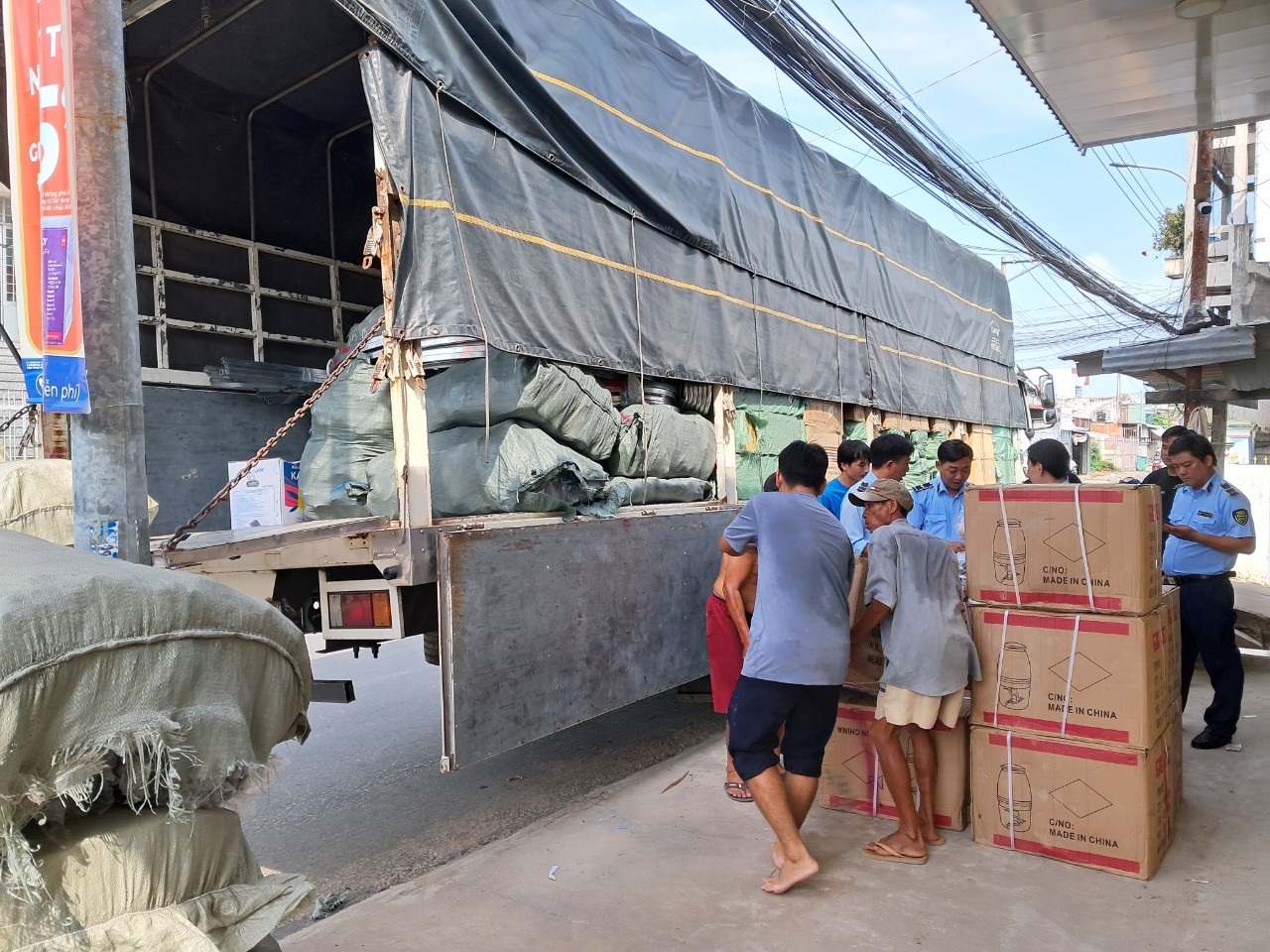 Phương tiện vận chuyển số lượng lớn hàng hóa không rõ nguồn gốc không có nhãn phụ tiếng Việt Ảnh: Cục QLTT An Giang