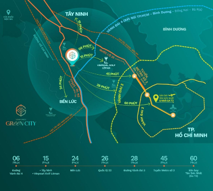 Vinhomes Green City kết nối dễ dàng với các tuyến giao thông trọng điểm Tây Bắc TP.HCMTừ Vinhomes Green City, cư dân chỉ mất khoảng 40-50 phút để đến trung tâm TP.HCM qua Quốc lộ 22 hoặc tuyến ĐT10 - CT02; 13km để đến trung tâm Đức Hòa và 40 km đến Tây Ninh (cũ) theo Quốc lộ 22. Hướng ra quốc tế bao gồm tuyến đường đến cửa khẩu Mộc Bài chỉ khoảng 40 phút lái xe.