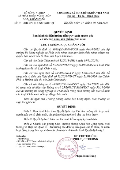 (VietQ.vn) - Trong xu thế hội nhập và số hóa ngành nông nghiệp, việc thiết lập một hệ thống truy xuất nguồn gốc (TXNG) hiệu quả, đồng bộ và phù hợp với chuẩn mực quốc tế ngày càng trở nên cấp thiết. Nhằm cụ thể hóa yêu cầu đó trong lĩnh vực chăn nuôi, ngày 28/2/2025, Cục Chăn nuôi (Bộ Nông nghiệp và Phát triển Nông thôn) đã chính thức ban hành tài liệu số 64/QĐ – CN-KHCNMT&HTQT: “Hướng dẫn truy xuất nguồn gốc đối với cơ sở chăn nuôi và sản phẩm chăn nuôi”.