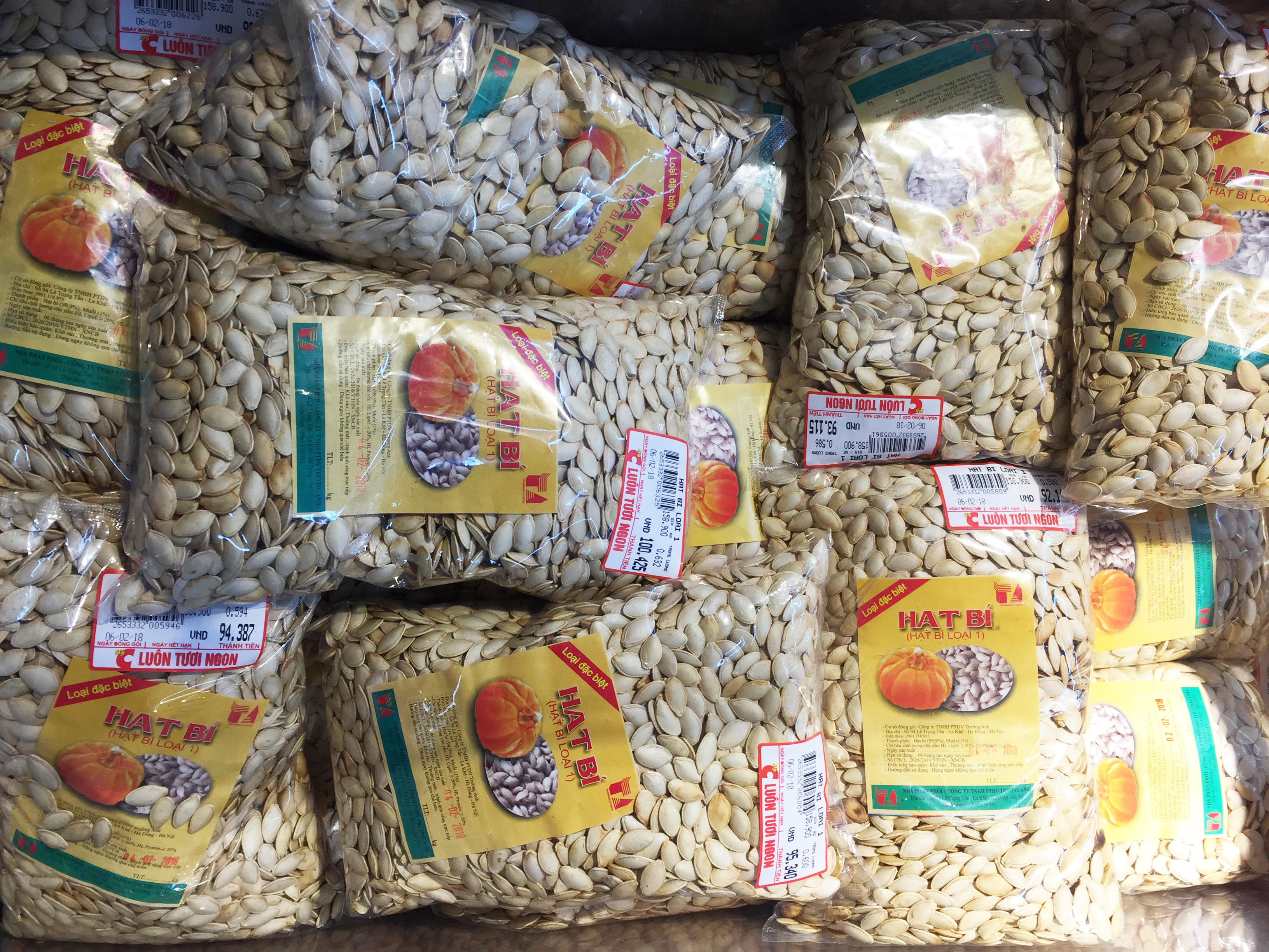 Theo khảo sát của PV Chất lượng Việt Nam (VietQ.vn), trên thị trường Hà Nội, các loại hạt sấy khô phục vụ Tết Nguyên đán Mậu Tuất 2018 được bày bán rộng rãi và có mặt ở hầu hết các cửa hàng bán bánh kẹo, các siêu thị dân dụng như BigC, Vinmart...