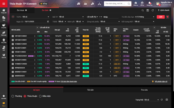 Bước 5: Chọn nền tảng giao dịch online thuận tiện. Hiện tại, TCBS là đơn vị tư vấn phát hành duy nhất đã ra mắt hệ thống Thỏa thuận trái phiếu iConnect để hỗ trợ nhà đầu tư rao mua/bán trái phiếu, tìm kiếm đối tác giao dịch trái phiếu. Hệ thống iConnect đang có 77.500 khách hàng tham gia, 973.000 lượt giao dịch, 14.000 lượt truy cập iConnect trung bình hàng ngày, 14.700 tỷ đồng khối lượng trái phiếu giao dịch năm 2023.
