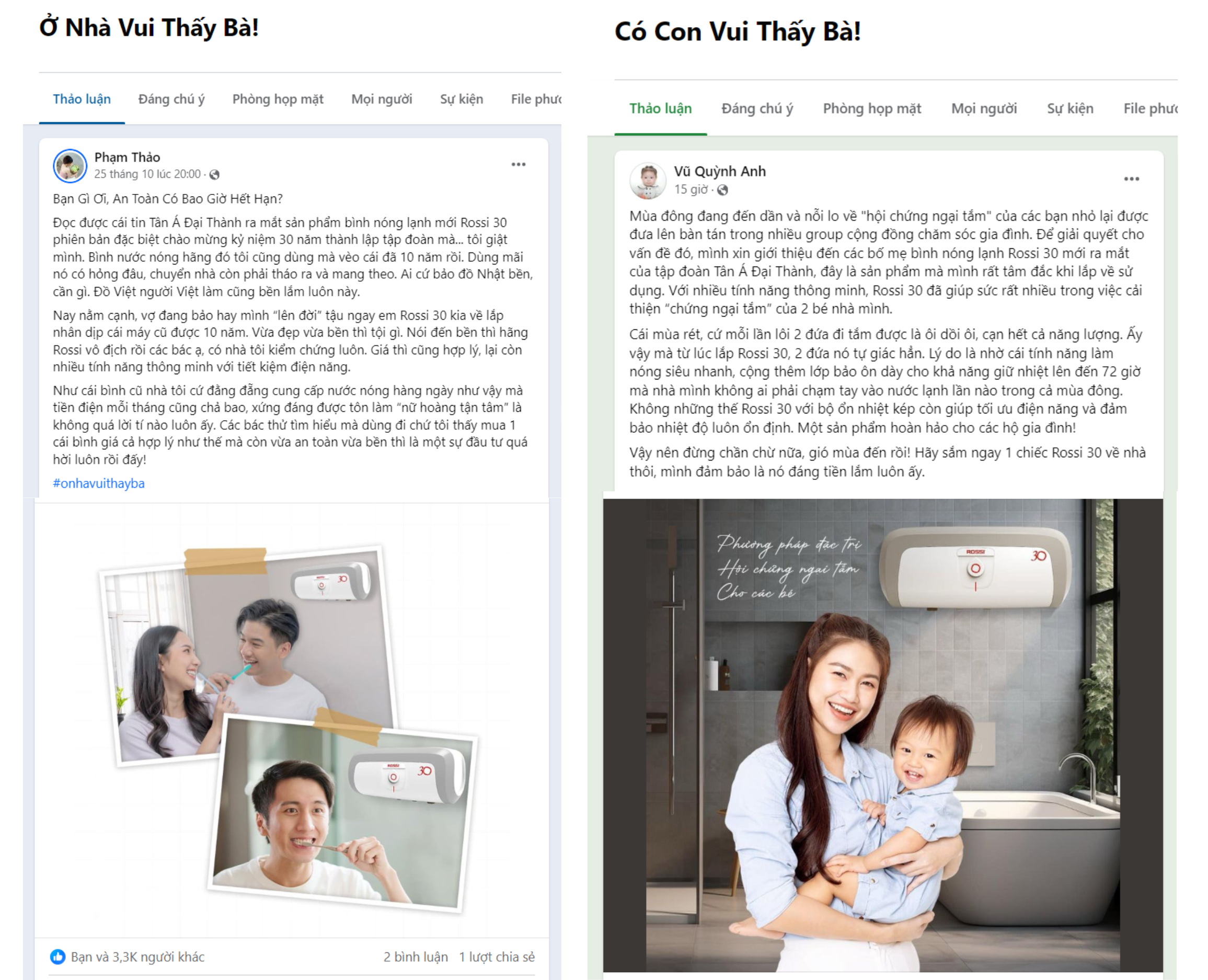 Các group cộng đồng gia đình trao đổi về sản phẩm bình nước nóng Rossi 30.