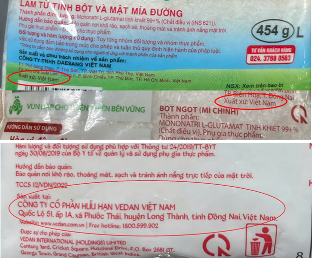 Cụ thể, bao bì của các sản phẩm này không có thông tin xuất xứ sản phẩm là từ Trung Quốc, tên công ty Trung Quốc sản xuất ra bột ngọt trước khi đóng gói cũng được ghi bằng tiếng Anh, gây nhầm lẫn cho người tiêu dùng.