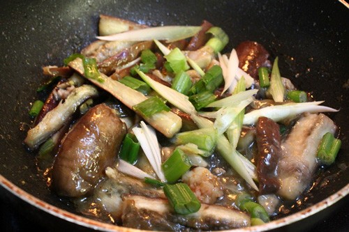 | Phi thơm hành khô rồi cho tôm và thịt gà vào xào chín |