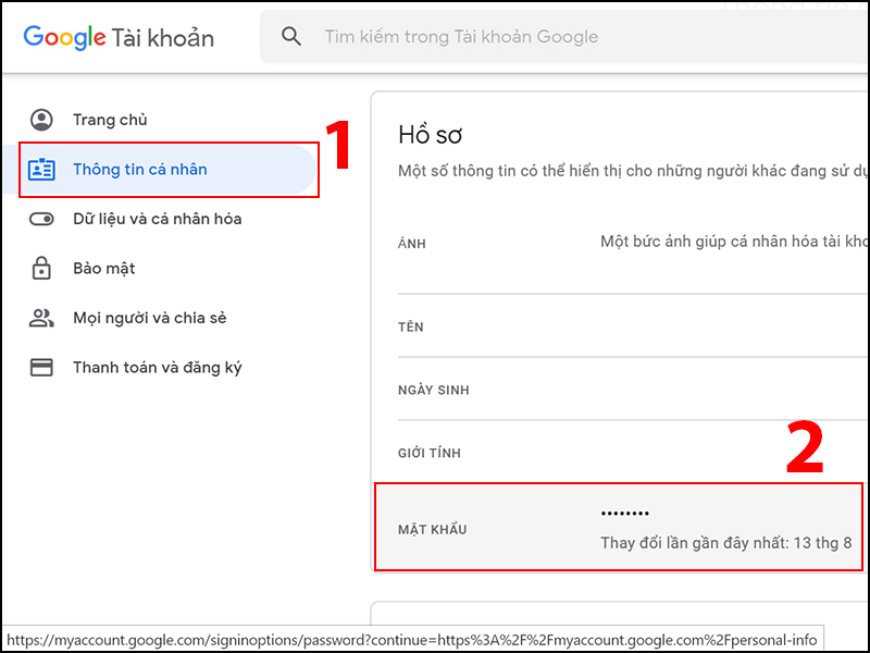 Bước 1: Bạn vào Quản lý tài khoản > Chọn Thông tin cá nhân > Mật khẩu.