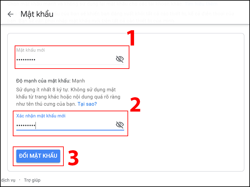 Bước 3: Nhập Mật khẩu mới > Nhập lại mật khẩu mới trong Xác nhận mật khẩu mới > Chọn ĐỔI MẬT KHẨU.