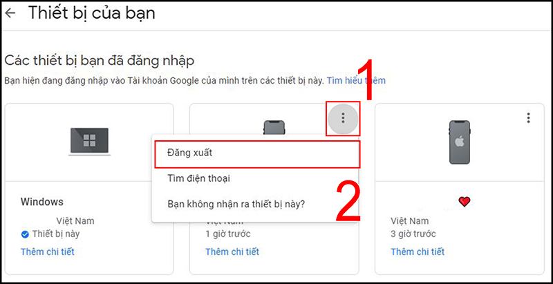 Bước 2: Giao diện hiển thị danh sách Các thiết bị bạn đã đăng nhập. Nếu nghi ngờ bất kỳ thiết bị đăng nhập nào bất thường, hãy thực hiện đăng xuất bằng cách nhấn vào dấu ba chấm tại góc phải trên thiết bị, chọn Đăng xuất. Sau đó, bạn có thể thay đổi mật khẩu và thiết lập các bước bảo mật thêm cho tài khoản của bạn.