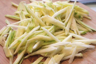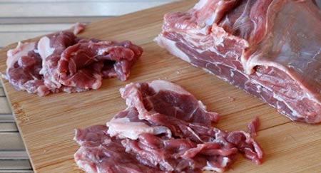- Thịt bò xắt miếng mỏng, ướp với ½ thìa cà phê hạt nêm, ½ tỏi băm tỏi khoảng 5 phút. Xoài gọt vỏ, xắt sợi to. Cà chua rửa sạch, bổ miếng cau. Rau răm rửa sạch thái nhỏ.
