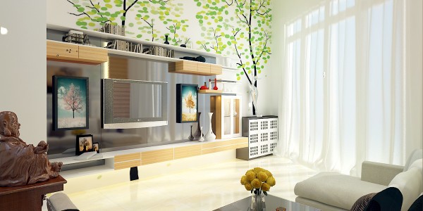 Không gian phòng khách thoáng đạt cùng với hệ gỗ ốp kệ sát tường. Họa tiết tranh vẽ nhánh cây mùa xuân trên tường đem đến cảm giác gần gũi với thiên nhiên.