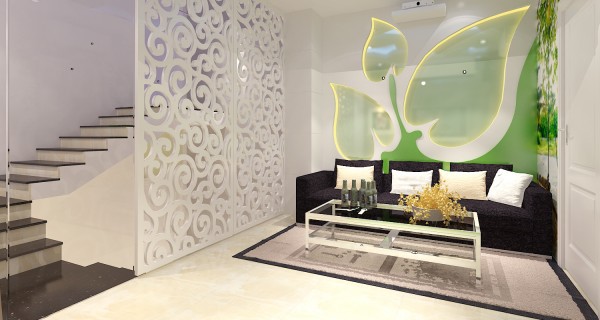 Họa tiết chiếc lá cùng với hệ đèn hắt đem lại hiệu quả ánh sáng và tạo chiều sâu cho căn phòng. Bộ sofa đen trên nền trắng kiến tạo nét hiện đại cho căn phòng và cũng là điểm nhấn cá tính.