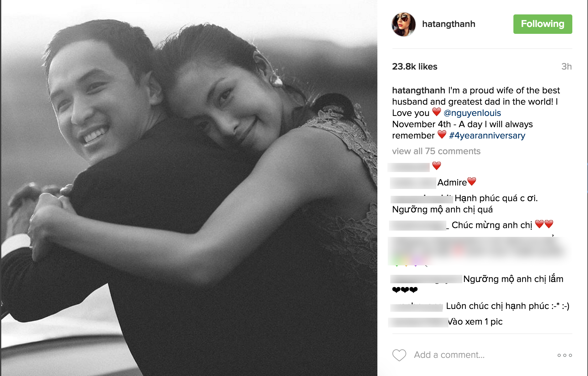 Trên trang Instargram, Tăng Thanh Hà đăng tải hình ảnh mới ghi lại khoảnh khắc tình tứ bên ông xã Louis Nguyễn. Cô viết: "I'm a proud wife of the best husband and greatest dad in the world! I Love you". (Tạm dịch: Em là một cô vợ rất tự hào về người chồng và người cha tuyệt vời nhất thế giới. Em yêu anh). Kèm theo đó, người đẹp cũng ghi chú dòng kỉ niệm 4 năm ngày cưới.