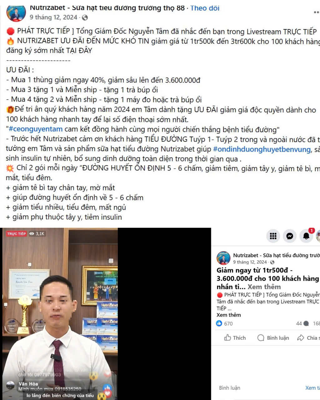 Thậm chí, trong nhiều video đăng tải trên mạng xã hội, tổ chức kinh doanh còn đăng tải hình ảnh khách hàng (chưa được kiểm chứng) giới thiệu đã dùng sữa Nutrizabet đạt kết quả tốt. Quả thực, với những nội dung quảng cáo nêu trên khiến không chỉ PV mà bất kỳ ai cũng đều bị cuốn hút. Nhưng đáng thương cho không ít người bệnh tin vào quảng cáo trên sẵn sàng chi tiền mua sản phẩm Nutrizabet sử dụng mà không biết rằng sản phẩm này không phải là thuốc, không có công dụng điều trị bệnh như quảng cáo.