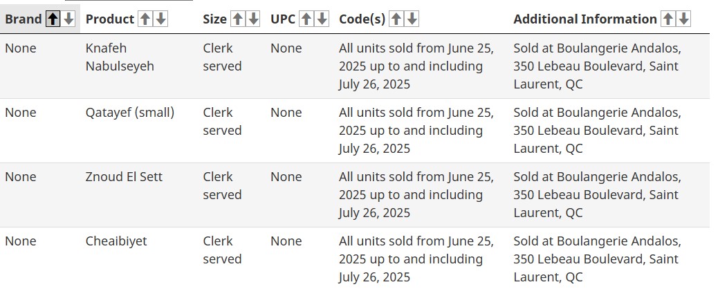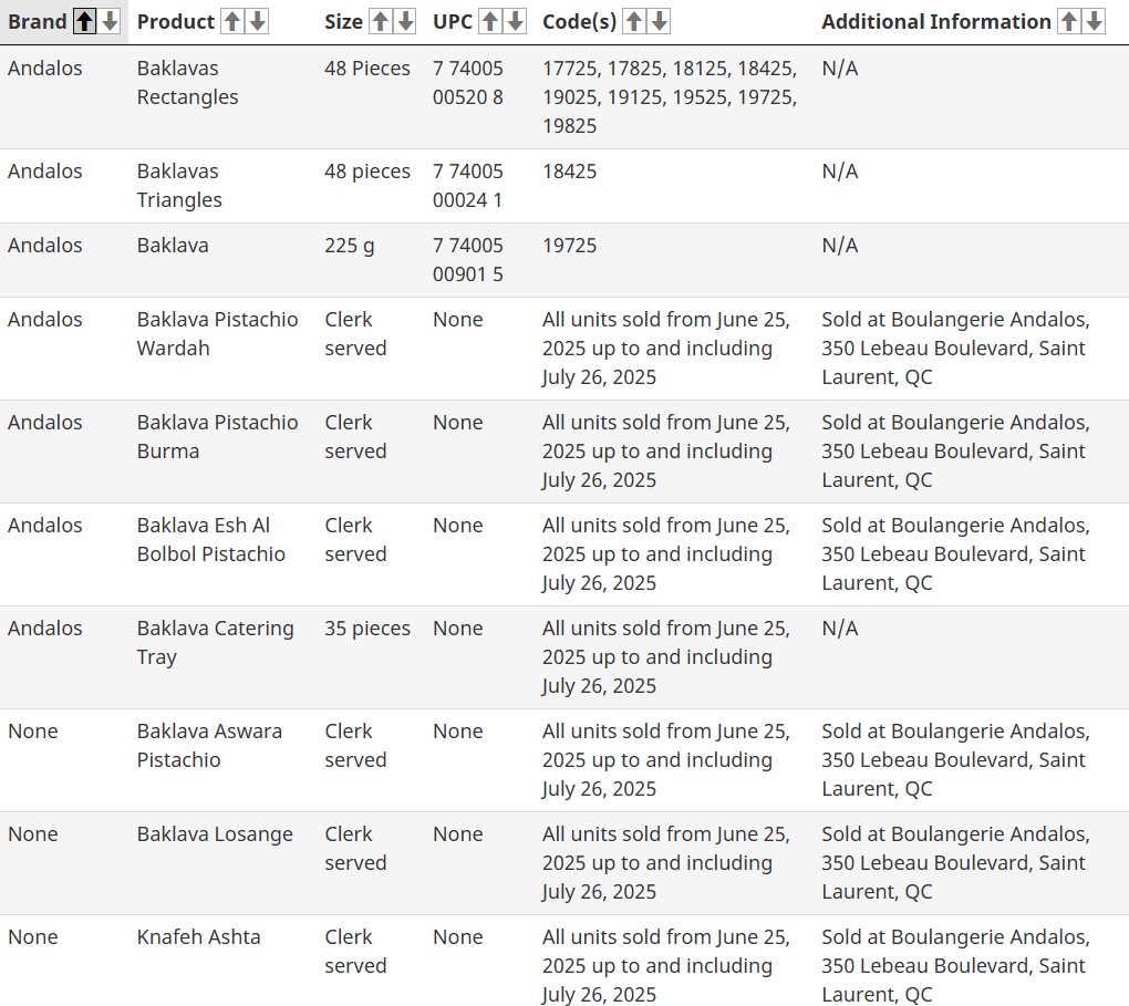 Trong thông báo ngày 7/8, CFIA cho biết đã thu hồi bảy sản phẩm bánh baklava của thương hiệu Andalos gồm: baklava hình chữ nhật, baklava hình tam giác, baklava truyền thống, baklava pistachio wardah, baklava pistachio burma, baklava esh al bolbol pistachio và khay baklava catering tray. Bên cạnh đó, bảy sản phẩm không có nhãn hiệu cũng nằm trong diện thu hồi, bao gồm baklava aswara pistachio, knafeh ashta và znoud el sett. Các sản phẩm này đã được phân phối tại các tỉnh Ontario, Quebec, New Brunswick và bán trực tuyến.