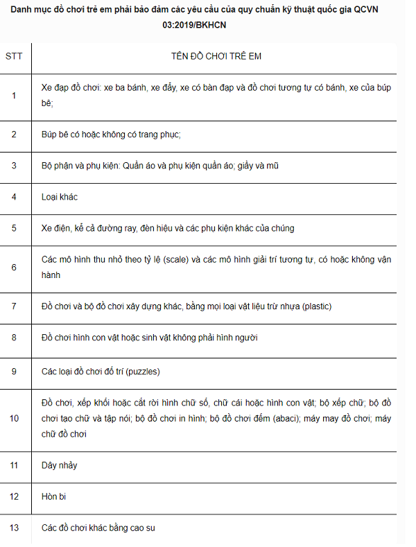 Đồ chơi trẻ em trước khi đưa ra lưu thông trên thị trường phải được chứng nhận hợp quy, công bố hợp quy đối với mặt hàng sản xuất trong nước hoặc được kiểm tra chất lượng khi nhập khẩu. Đồ chơi trẻ em phải đáp ứng được các yêu cầu quy định tại Quy chuẩn kỹ thuật quốc gia QCVN 03:2019/BKHCN về an toàn đồ chơi trẻ em như yêu cầu an toàn về cơ lý, về tính cháy, về hóa học và về an toàn điện đối với đồ chơi trẻ em sử dụng điện (kèm theo Danh mục đồ chơi trẻ em phải bảo đảm các yêu cầu của QCVN 03:2019/BKHCN).