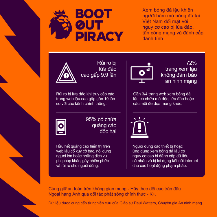 “Thông qua chiến dịch Boot Out Piracy, chúng tôi muốn nhấn mạnh rằng, việc xem các trận đấu Ngoại hạng Anh qua website hoặc thiết bị lậu không chỉ khiến người dùng đặt mình và gia đình vào nguy cơ bị đánh cắp dữ liệu, tấn công mạng hoặc lừa đảo, mà còn có thể gây tổn thất lớn về tài chính. Chúng tôi rất vui khi được hợp tác cùng K+ để lan tỏa thông điệp quan trọng này tới người hâm mộ tại Việt Nam và khuyến khích người xem hãy lựa chọn các kênh chính thức để thưởng thức bóng đá Premier League một cách an toàn và có trách nhiệm”- Tổng Cố vấn của Ngoại hạng Anh nhấn mạnh.