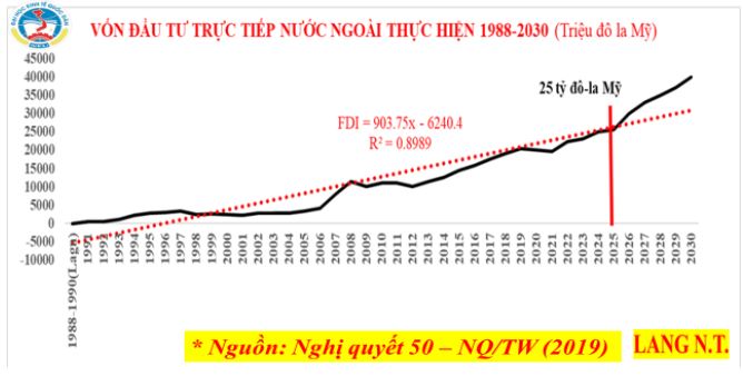 Thứ 3, đầu tư trực tiếp nước ngoài (FDI) tăng nhanh và đang bước vào giai đoạn 3 - tăng tốc thu hút đầu tư. Mỗi năm thu hút ít nhất 25-30 tỷ đô la Mỹ (Hình 4) theo đúng Nghị quyết 50 – BCT về hoàn thiện cơ chế, chính sách thu hút FDI. Nguồn lực này đang được hướng vào xuất khẩu cho nên sẽ tạo động lực tăng trưởng mạnh và khai thác thị trường trong nước. Các nhà đầu tư coi Việt Nam là nơi đầu tư hiệu quả. Tuy nhiên, việc tận dụng triệt để 17 hiệp định thương mại được Việt Nam ký kết chưa đáng kể, mới chỉ khoảng 30% ưu đãi.