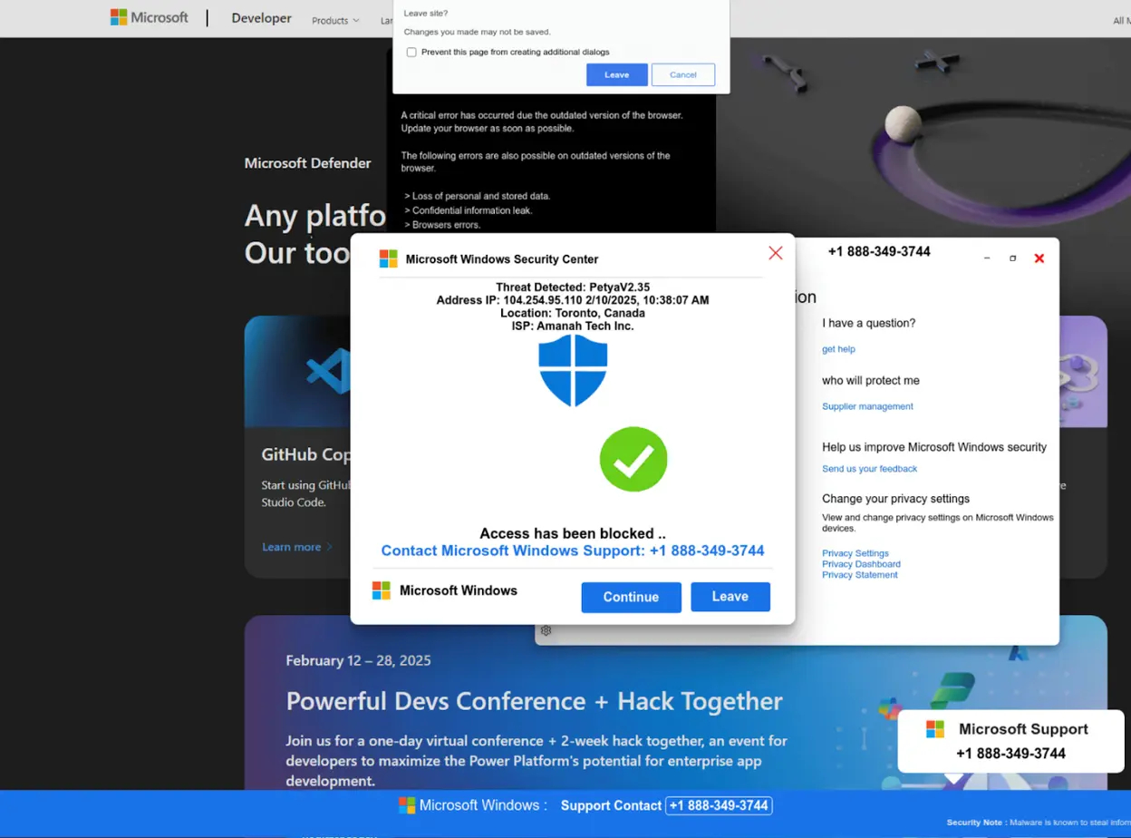 Theo chuyên gia Denis Sinegubko làm việc tại Công ty an ninh mạng GoDaddy, “chiến dịch này tập trung vào các trò lừa hỗ trợ kỹ thuật, sử dụng thủ thuật điều khiển toàn màn hình trình duyệt và ngăn chặn thoát trang, nhằm giữ nạn nhân trên các trang giả mạo cảnh báo bảo mật Microsoft Windows, đồng thời tận dụng kênh kiếm tiền phụ qua dịch vụ hẹn hò, tiền điện tử và xổ số lừa đảo”.