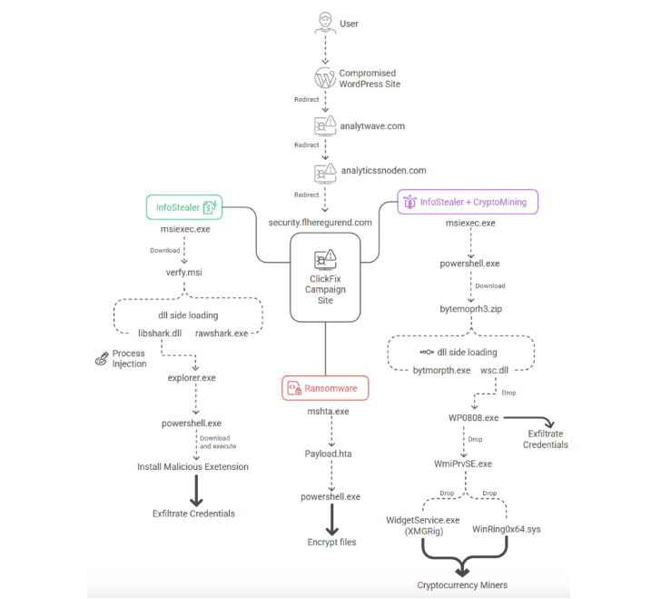 Các cuộc tấn công bắt đầu khi người dùng vô tình truy cập một trang WordPress bị cài mã JavaScript độc hại. Mã này tạo chuỗi chuyển hướng tới trang CAPTCHA giả của Google hoặc Cloudflare. Từ đây, nạn nhân bị dẫn dắt theo hai hướng khác nhau, tùy vào chỉ dẫn ClickFix hiển thị. Một nhánh hướng dẫn sử dụng hộp thoại Windows Run. Nhánh còn lại yêu cầu nạn nhân lưu trang dưới dạng HTML Application (HTA) rồi chạy bằng mshta.exe.