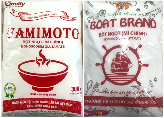 Mặt sau bao bì mì chính san chia, đóng lại (trái) và mì chính sản xuất trực tiếp tại Việt Nam (phải).Các sản phẩm mì chính san chia, đóng gói lại có mặt sau bao bì thường ghi các thông tin: Đóng gói tại, hoặc Cơ sở đóng gói, hoặc Phối trộn tại, hoặc Hoàn tất tại…
