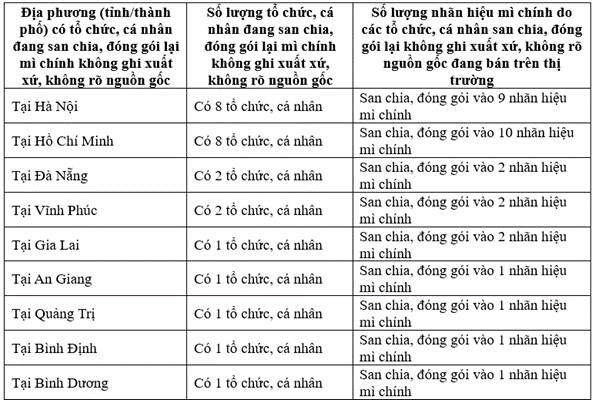 Dựa trên thông tin ghi trên bao bì của các loại mì chính không rõ nguồn gốc, xuất xứ được các tổ chức, cá nhân san chia, đóng gói lại và bán trên thị trường, loại mì chính này đang được các tổ chức, cá nhân san chia, sang chiết và đóng gói lại tại các địa phương sau đây: