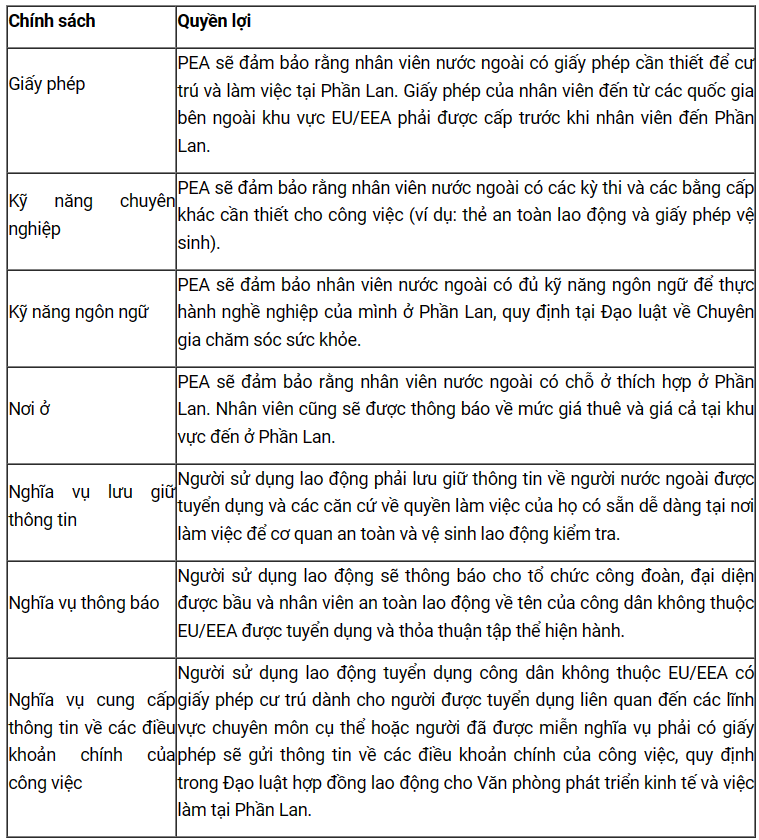 Mục đích của quy tắc nhằm đảm bảo rằng, các công ty thành viên của HPL cam kết hành động có đạo đức và hợp pháp khi tuyển dụng nhân viên nước ngoài, góp phần cải thiện tình trạng trong chính sách tuyển mộ nhân tài và thu hút người tài nước ngoài vào làm việc tại Phần Lan theo tóm tắt ở bảng 1.