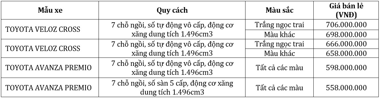 Veloz Cross và Avanza Premio sản xuất và lắp ráp trong nước sẽ chính thức có mặt tại tất cả đại lý của Toyota trên toàn quốc từ tháng 12/2022 với mức giá bán lẻ như sau: