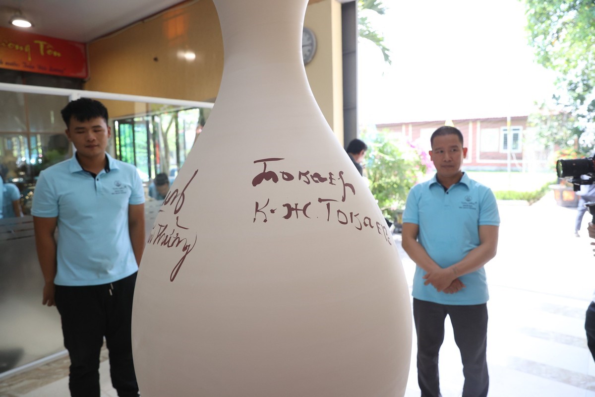Tên Chủ tịch nước Võ Văn Thưởng và Tổng thống Kazakhstan trên một bình gốm Chu Đậu.
