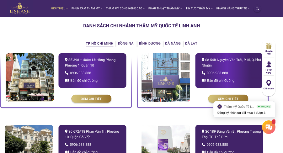 Thẩm mỹ viện Linh Anh với loạt chi nhánh trải dài từ TP.HCM đến Đà Nẵng. (Ảnh chụp màn hình)