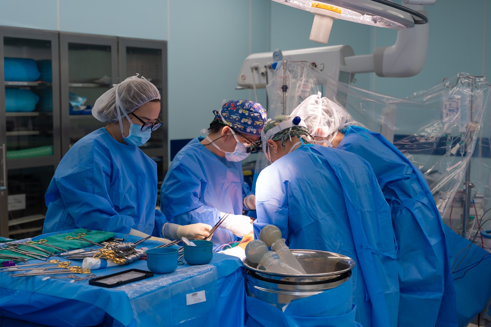 TS. BS Đào Đức Dũng (thứ 2 từ trái sang) đang cùng ê-kíp thực hiện ca ghép gan