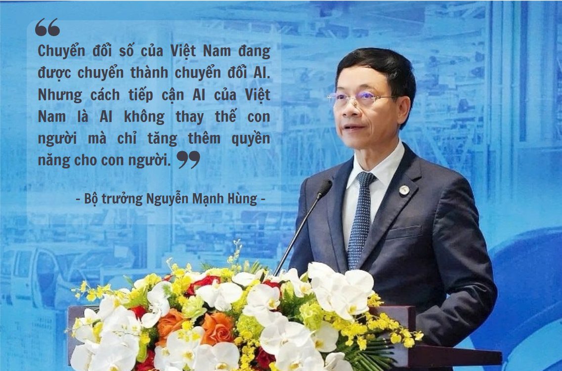 Tại Phiên thảo luận cấp Bộ trưởng với chủ đề "Công nghệ đột phá cho chuyển đổi xanh và phát triển bền vững trong kỷ nguyên trí tuệ" trong khuôn khổ Hội nghị Thượng đỉnh P4G 2025 mới đây, Bộ trưởng Bộ Khoa học và Công nghệ Nguyễn Mạnh Hùng cho biết, chuyển đổi số (CĐS) tại Việt Nam đang dịch chuyển mạnh mẽ thành chuyển đổi AI. Tuy nhiên, cách tiếp cận AI của Việt Nam không nhằm thay thế con người, mà để tăng quyền năng cho con người (Empower con người). AI giúp giải phóng con người khỏi những công việc nặng nhọc hoặc có đặc thù mà con người không giỏi như ghi nhớ lượng thông tin khổng lồ, xử lý dữ liệu phức tạp. Nhờ đó, con người có thể tập trung vào những nhiệm vụ sáng tạo, tư duy trừu tượng và tưởng tượng - những lĩnh vực mà AI còn hạn chế. AI sẽ là trợ lý, giúp con người thông minh hơn, mọi hoạt động trở nên tối ưu hơn và tiết kiệm tài nguyên hơn.