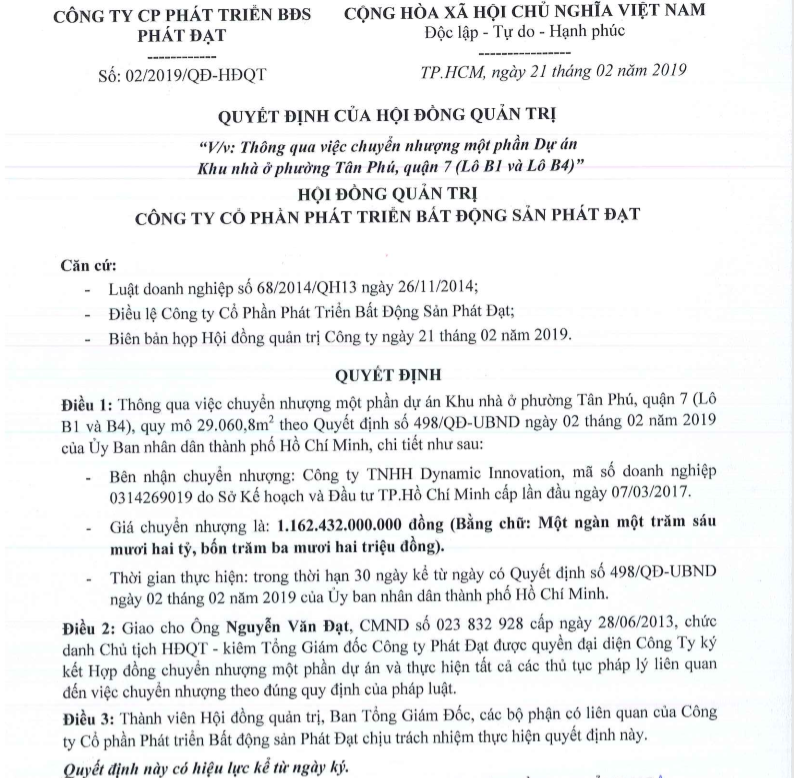 Quyết định của HĐQT Phát Đạt cũng giao cho ông Nguyễn Văn Đạt - Chủ tịch HĐQT kiêm TGĐ được quyền đại diện công ty ký kết hợp đồng chuyển nhượng một phần dự án và thực hiện tất cả các thủ tục pháp lý liên quan đến việc chuyển nhượng theo quy định của pháp luật.