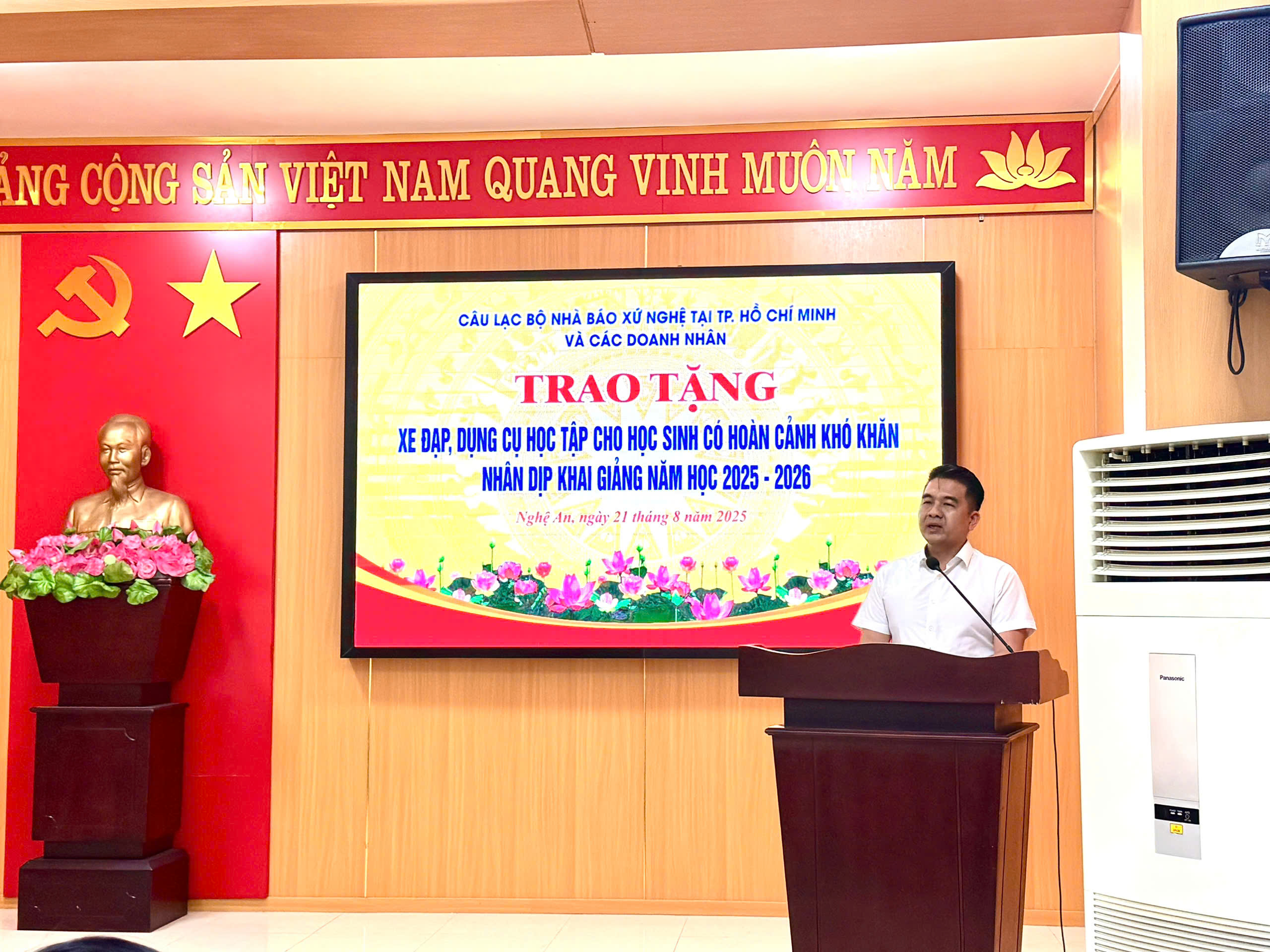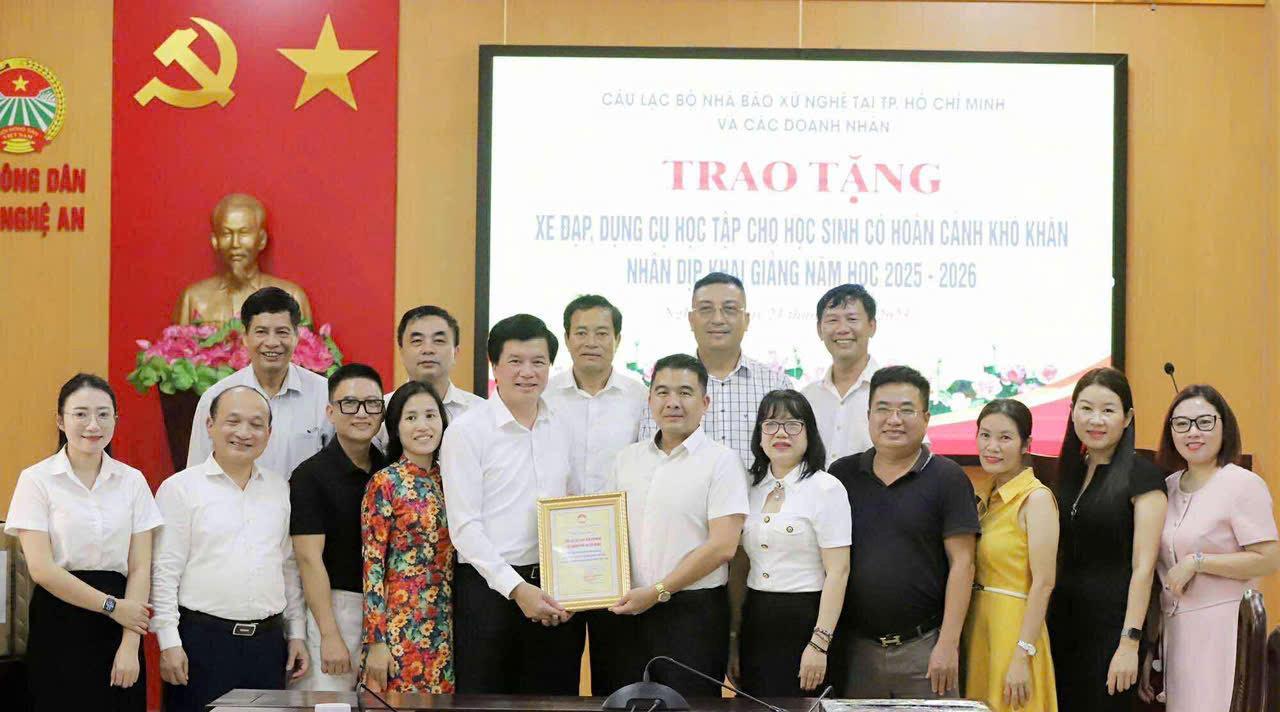 CLB Nhà báo Xứ Nghệ tại TP.HCM cùng các doanh nhân trao biểu trưng xe đạp và dụng cụ học tập cho Hội Khuyến học tỉnh Nghệ An.
