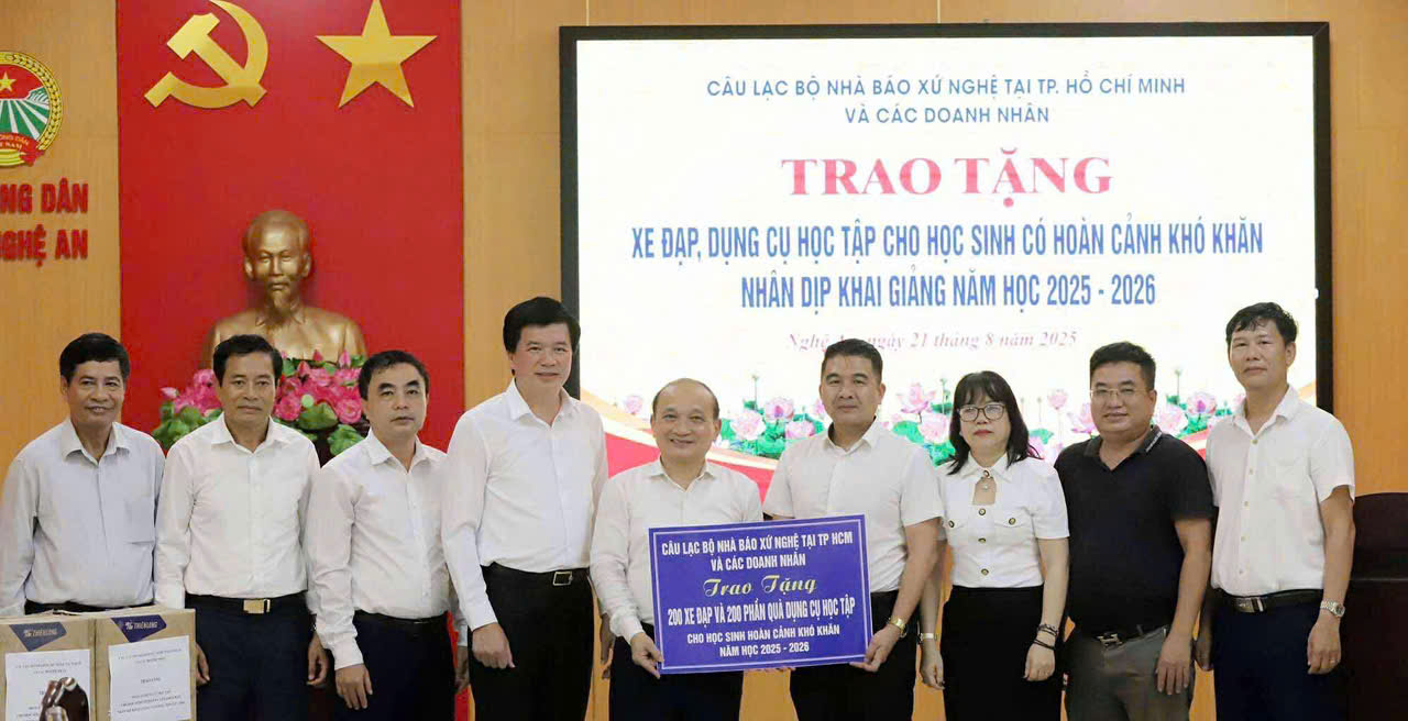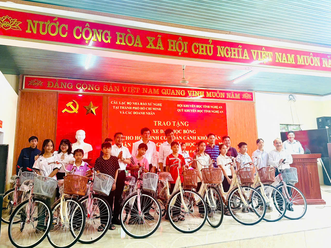 Ngày 21 và 22/8, tại nhiều địa phương trên địa bàn tỉnh Nghệ An, Câu lạc bộ Nhà báo Xứ Nghệ (CLB) tại TP.HCM đã trao tặng 200 chiếc xe đạp, 200 phần quà dụng cụ học tập, 40 suất học bổng, cùng 2 máy tính xách tay và 1 máy phát điện cho học sinh nghèo hiếu học. Đây là hoạt động trong chương trình thiện nguyện “Nâng bước em đến trường”, được CLB phát động nhân dịp kỷ niệm 5 năm thành lập.