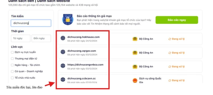 Ngày 24/1, Cục Cảnh sát Quản lý hành chính về trật tự xã hội (C06), Bộ Công an cho biết, để kịp thời cảnh báo, cung cấp danh sách các trang web và liên kết độc hại giúp người dân phòng tránh, C06 đã cập nhật nội dung hướng dẫn tra cứu trang web lừa đảo do Trung tâm Giám sát an toàn không gian mạng quốc gia xây dựng. Người dân có thể sử dụng mục Tin tức trên ứng dụng VNeID, hoặc truy cập vào trang thông tin tinnhiemmang.vn để thực hiện tra cứu thông tin các tên miền độc hại, lừa đảo nhằm bảo vệ an ninh, an toàn trên không gian mạng.