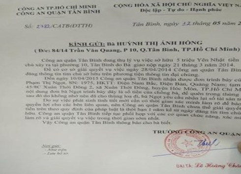 Sáng ngày 12/5, Đại tá Lê Hoàng Châu – Trưởng Công an quận Tân Bình, TP.HCM đã ký thông báo, gửi chị Huỳnh Thị Ánh Hồng (ngụ tại đường Trần Văn Quang, phường 10 – quận Tân Bình, TP.HCM) về vấn đề xử lý số tiền 5 triệu Yên Nhật mà chị Hồng đã nhặt được.