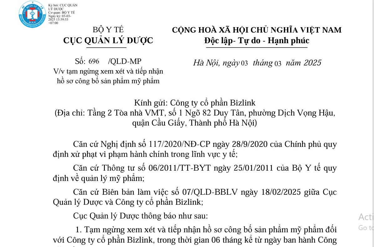 Theo Cục Quản lý Dược, Công ty cổ phần Bizlink đã kê khai không trung thực các nội dung trong phiếu công bố sản phẩm mỹ phẩm, vi phạm quy định tại điểm k khoản 1 Điều 47 Thông tư số 06/2011/TT-BYT ngày 25.1.2011 của Bộ Y tế quy định về quản lý mỹ phẩm. Do đó, Cục tạm ngừng xem xét và tiếp nhận hồ sơ công bố sản phẩm mỹ phẩm đối với Công ty cổ phần Bizlink, trong thời gian 6 tháng, kể từ ngày 3/3/2025.