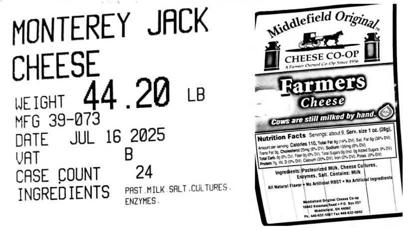 5. Farmers Cheese (gói 227g, khối 2,27kg và 18kg, mã lô 251672 và 7-16-25B);