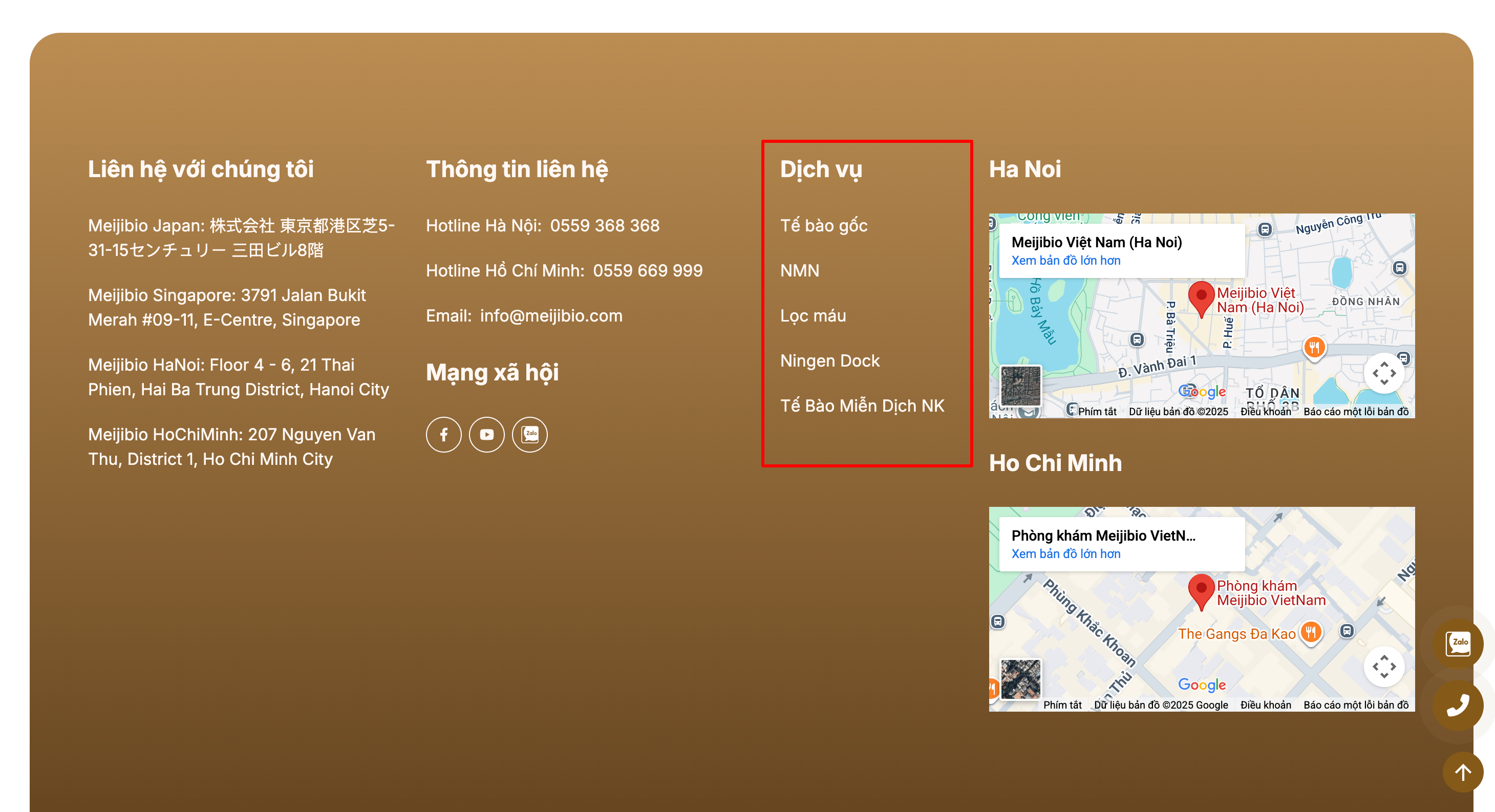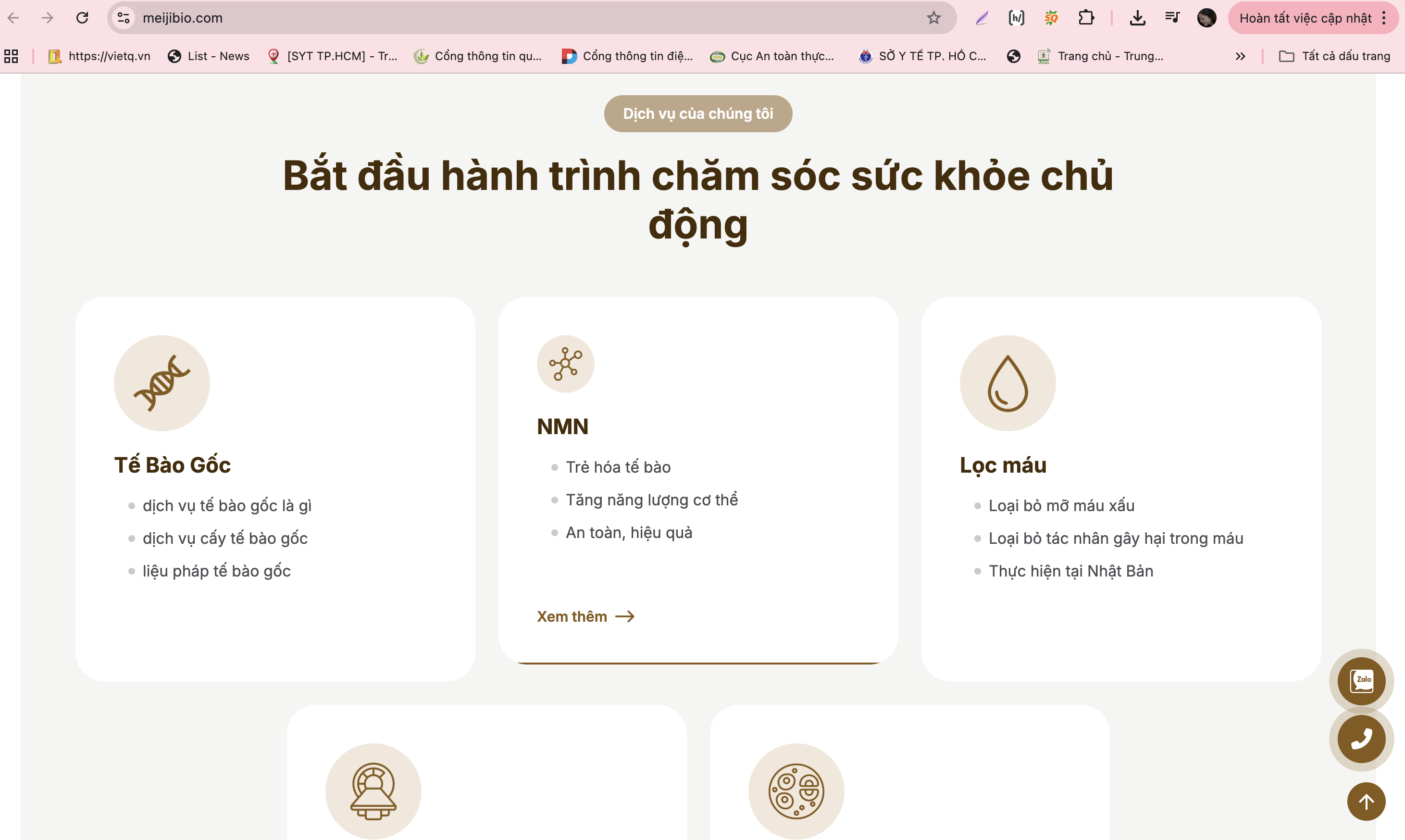 Trên website “meijibio.com” của Công TNHH Meijibio Việt Nam đang quảng cáo cung cấp các dịch vụ như liệu pháp tế bào gốc, trẻ hoá NMN, NAD+, lọc máu, tế bào miễn dịch NK,…