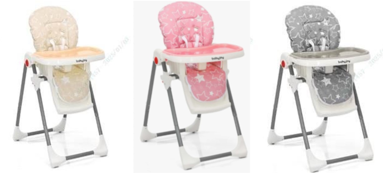 Ghế ăn dặm Babyjoy có thiết kế gập gọn, gồm các màu hồng (mã BB5656PI), be (mã BB5656BE) và xám (mã BB5656GR). Ghế được trang bị giá đỡ chân, khay tháo rời, đệm ghế in họa tiết ngôi sao, cùng bốn bánh xe có khóa. Người dùng có thể điều chỉnh độ cao và độ nghiêng. Tên “Babyjoy” được in phía trước khay, còn nhãn “Goplus Corp.” xuất hiện ở lưng ghế. Sản phẩm được bán trực tuyến trên Amazon.com, Walmart.com, Costway.com và Shein.com từ tháng 11/2022 đến tháng 11/2024, giá dao động từ 70 USD đến 110 USD.