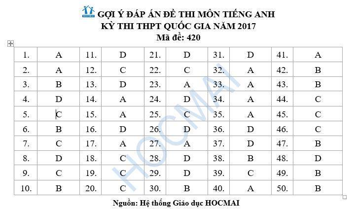 Đáp án đề thi môn Tiếng Anh kỳ THPT quốc gia năm 2017 các mã đề
