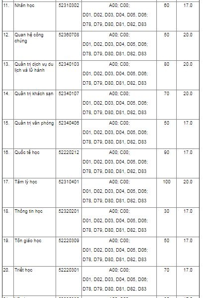 Các ngành còn lại nhận hồ sơ từ 15,5 điểm trở lên gồm: hệ thống thông tin quản lý, công nghệ sinh học, Đông Nam Á, xã hội học, công tác xã hội, ngôn ngữ Trung Quốc, các ngành chất lượng cao (quản trị kinh doanh, luật kinh tế, tài chính ngân hàng, kinh tế, ngôn ngữ Anh).