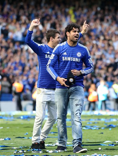 Diego Costa đang chấn thương không thể thi đấu nhưng anh vẫn xuống sân ăn mừng cùng đồng đội. Tiền đạo người Tây Ban Nha có 19 bàn thắng tại Premier League ở mùa giải năm nay, phía sau anh là Oscar, người cũng không thể thi đấu trận này
