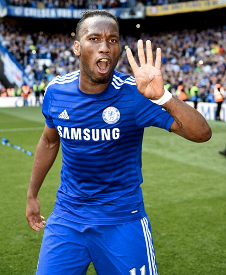 Lão tướng Didier Drogba ra dấu hiệu, ám chỉ số lần anh vô địch Ngoại hạng Anh với Chelsea. Tiền đạo có biệt danh "Voi rừng" từng chia tay sân Stamford Bridge năm 2012, trước khi trở lại đầu mùa giải này.