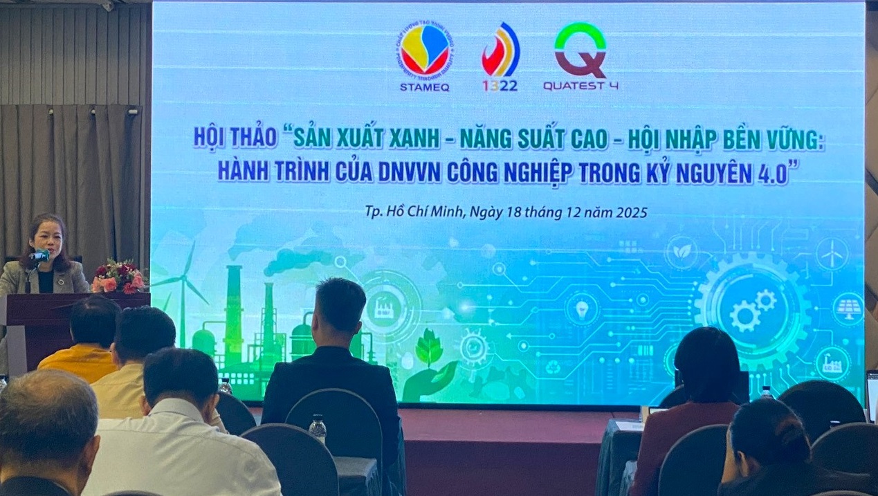 Ngày 18/12, tại TP.HCM, Trung tâm Kỹ thuật Tiêu chuẩn Đo lường Chất lượng 4 (QUATEST 4), Ủy ban Tiêu chuẩn Đo lường Chất lượng Quốc gia, Bộ Khoa học và Công nghệ đã tổ chức Hội thảo: “Sản xuất xanh – Năng suất cao – Hội nhập bền vững: Hành trình của doanh nghiệp nhỏ và vừa công nghiệp trong kỷ nguyên 4.0”. Chương trình nhằm cung cấp thông tin, định hướng chính sách và chia sẻ các giải pháp, kinh nghiệm thực tiễn giúp doanh nghiệp nâng cao năng suất chất lượng, tăng cường năng lực cạnh tranh và phát triển bền vững.